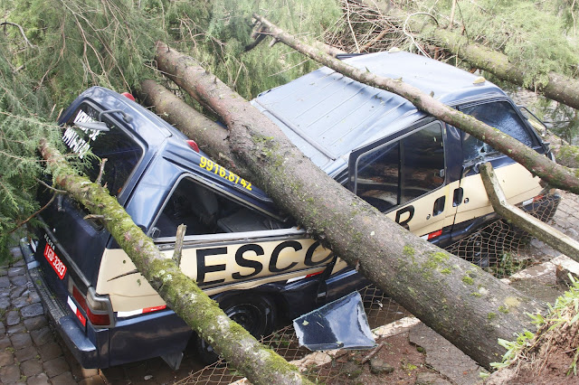 Na Rua Pinheiro Machado, o trânsito também foi interrompido. Caíram duas árvores, uma em cima de um veículo. Há poucos metros dali, na Rua Dr. Rivota, árvores localizadas no pátio do Hospital Militar caíram em cima de uma van escolar.